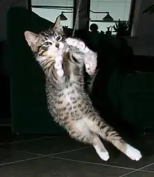 There are several different motor patterns associated with the play behaviour of cats and they have different roles in the social context.[6] Pouncing is used to initiate play through physical contact. Kittens exhibit their preference for physical contact play by rolling and exposing the abdomen and rearing up on the hind legs.[6] Chasing and horizontal leaping are examples of motor patterns that may be used to end play. The varying speed and directional movement of a cat's tail can be a useful indicator of its level of playfulness.