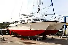 The Catalac company's main model was the 9-metre 9M. All the other models are derived from the 9M and use a similar design concept; the 8M even used the same hulls as the 9M.[2] All Catalacs were very strongly-built with thick grp hulls and glass windows. Some of the superstructure, such as the solid foredeck, was of sandwich grp construction. Compared to modern designs, Catalacs had a narrow beam of less than half the LOA,[3] and vertical transoms (rather than the more modern "sugar scoop" with transom steps). Initially featuring lifting dinghy-type rudders, Catalac moved to fixed rudders protected by a skeg; this allowed the boats to sail a little closer to the wind. Only the 9M has a staggered sheerline (which allows easy aft access from a pontoon); the other models all have an unbroken sheerline.