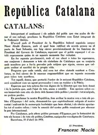The Catalan Republic (Catalan: República Catalana, IPA: [rəˈpubːlikə kətəˈlanə]) was a state proclaimed in 1931 by Francesc Macià as the "Catalan Republic within the Iberian Federation",[2][3] in the context of the proclamation of the Second Spanish Republic. It was proclaimed on 14 April 1931, and superseded three days later, on 17 April, by the Generalitat de Catalunya, the Catalan institution of self-government within the Spanish Republic.[4]
