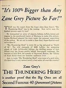 Registered as privately-owned agricultural livestock in a fenced-restricted area, it has been commonly reported that the bison were imported in 1924 for the silent film version of Zane Grey's Western tale, The Vanishing American.[2] However, the 1925 version of The Vanishing American does not contain any bison and shows no terrain that resembles Catalina, according to Jim Watson, columnist for The Catalina Islander newspaper. In an October 6, 1938 article in The Catalina Islander, he attributes the bison arrival to the filming of The Thundering Herd, a silent film released in 1925.[3] A September 1938 article in Nation's Business said the herd then numbered about 30 animals and was left behind with Wrigley's permission after a Lasky Western filmed on the island in 1925.[4] Contemporaneous reports in the Los Angeles Times and New York Times state that The Thundering Herd used a collection of Yellowstone National Park animals herded together for the movie.[5][6] Other shooting locations were the Sierra Nevada mountains and Calabasas.[7][8]