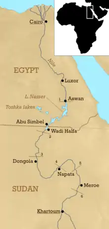 In ancient times, Upper Egypt extended from south of the Nile Delta to the first cataract, while further upstream, the land was controlled by the ancient Kingdom of Kush that would later take over Egypt from 760 to 656 BC.[3] Besides the Kushite invasion, for most of Egyptian history, the Nile's cataracts, particularly the First Cataract, primarily served as a natural border to prevent most crossings from the south, as those in said region would rely on river travel to venture north and south. This allowed Egypt's southern border to be relatively protected from invasions, and besides brief Kushite rule, it remained a natural border for most of Egyptian history.[4]