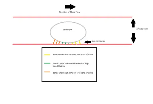 An important example of catch bonds is their role in leukocyte extravasation. During this process, leukocytes move through the circulatory system to sites of infection, and in doing so they 'roll' and bind to selectin molecules on the vessel wall. While able to float freely in the blood under normal circumstances, shear stress induced by inflammation causes leukocytes to attach to the endothelial vessel wall and begin rolling rather than floating downstream. This “shear-threshold phenomenon” was initially characterized in 1996 by Finger et al. who showed that leukocyte binding and rolling through L-selectin is only maintained when a critical shear-threshold is applied to the system.[46] Multiple sources of evidence have shown that catch bonds are responsible for the tether and roll mechanism that allows this critical process to occur. Catch bonds allow increasing force to convert short-lived tethers into stronger, longer-lived binding interactions, thus decreasing the rolling velocity and increasing the regularity of rolling steps. However, this mechanism only works at an optimal force. As shear force increases past this force, bonds revert to slip bonds, creating an increase in velocity and irregularity of rolling.[47]