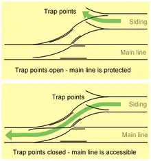 Trap points are found at the exit from a siding or where a secondary track joins a main line. A facing turnout is used to prevent any unauthorised movement that may otherwise obstruct the main line.[1] The trap points also prevent any damage that may be done by a vehicle passing over points not set for traffic joining the main line.[2] In the United Kingdom, the use of trap points at siding exits is required by government legislation.[2]