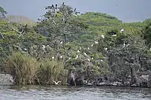 The lake and its twelve islands have been designation as a federal natural park.[7] The largest of these islands is Agaltepec, 750 meters long and 150 at its widest, covering 8.5 hectares. This name is from Pipil and Nahuatl and means “stone canoe” or “canoe hill.” It is also called Crocodile or Dragon Island in reference to is shape which resembles the animal when seen from certain perspectives. Its vegetation remains intact with over 1,600 trees of 63 species. In 1988 and 1989, two groups of howler monkeys, which are in danger of extinction, were brought to the Agaltepec Island as an attempt to preserve the species. Since then the animals have multiplied with over 100 and their cries can be heard in the nearby city. The island is federal property and is maintained by the Universidad Veracruzana.[5] There is also an archeological site on the island.[7] Tanaxpillo, better known as the “Island of the Monkeys.” This name and fame comes from a colony of stump-tailed macaques that live there, introduced as part of a research project in the 1970s. They are maintained by the university although they are also fed by local boat operators.[4][5] One other popular island for visitors is the Heron Island (Isla de las Garzas), a sanctuary of the species, which cover the trees and have painted them white from their excrement.[4][7]
