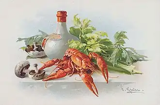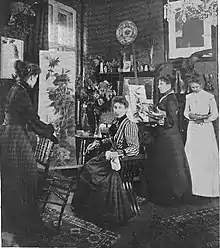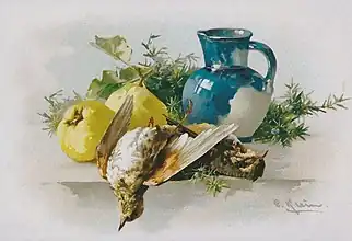 From 1890 on her pictures were shown in exhibitions, especially in Berlin, Dresden and Munich;[1] she also took part in the 1893 World's Fair in Chicago.[5] The works quickly became popular and Klein soon belonged to the circle of the most popular still life painters.[6] Her works were then represented in well-known art collections and the royal palaces of Berlin,[1] and the German Emperor Wilhelm II also bought paintings by the artist.[7] At about the same time, Klein ran a much-visited student studio.[1] The participants from all over the world included, for example, Maria Marc,[8] Maria Strakosch-Giesler,[9] the Baltic German Hildegard von Haken[10] and the American Teana McLennan Hinman.[11]