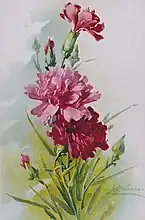 Klein was considered an important representative of flower painting during her lifetime, as the German-language encyclopedia Brockhaus Enzyklopädie noted in 1911.[18] In 1905, another German-language encyclopedia, Meyers Konversations-Lexikon, classified the painter among those who "know how to combine the truth of the characteristics with the richness and virtue of the colouring".[19] By that time, Klein's reputation preceded her; various authors and magazines recognized Klein and her work and she was a household name in large parts of the population.[20] The "ingenious"[21] flower painter would paint "professional hand" still lifes that were "highly expressive". Perfect, "amazing" technique is combined with her "soulful penetration of the material". You can literally feel the stirring of the petals, you can guess the fragrance that emanates from them.[22][23] The focus is not on "timidity" and "scrupulously correctness" but rather on "the spirit of free composition".[3] In addition to the informal, random position of the bouquets,[22] the "brisk"[20] painting also contributes to this.[3] Just as only a "real" artist is able to make use of, Klein captures the liveliness and atmosphere of the flowers.[22][23] She also succeeds in convincing the viewer with each new piece of flowers that this one is the most beautiful.[24] Because of the "excellent decorative effect" the pictures were recommended both as room decorations and as colouring pages.[21] Shortly after Klein's death, Vincenz Berger named a variety of roses[25] and Kurt Engelhardt a variety of dahlia[26] after her in recognition of her life's work.
