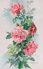 Klein's artistic output consisted of more than two thousand paintings.[13] Klein painted birds, butterflies, fruit, mushrooms, and table settings. She also created works to celebrate Christmas and Easter.[6] However, she devoted most of her work to wild and garden flowers with a vast number of roses. The Victorian-Wilhelminian era produced hundreds of new varieties. Above all, the hybrid tea roses with their lush flower shape and countless colour variations held a special fascination.[17] In line with this, the painter used heavy, tinted paper. The background of the picture was usually designed with watercolours, the actual motif was created by applying water-soluble top paints. Klein added chinese white to the latter to increase the colour brilliance, but also to simplify later lithographic reproductions.[11] Much of Klein's work was lost during World War II.[6]