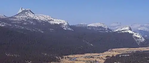 Cathedral Peak is part of the Cathedral Range, a mountain range in the south-central portion of Yosemite National Park in eastern Mariposa and Tuolumne Counties. The range is an offshoot of the Sierra Nevada. The peak which lends its name to the range derives its name from its cathedral-shaped peak, which was formed by glacial activity: the peak remained uneroded above the glaciers in the Pleistocene.
