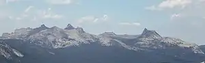 The Cathedral Peak Granodiorite forms part of the central eastern Sierra Nevada in California. It is exposed in glaciated outcrops from the upper Yosemite Valley into the high Sierra Divide. It covers large parts of Mariposa County and Tuolumne County and also touches Madera County and Mono County. At its northern end it includes Tower Peak and Matterhorn Peak, at 12,264 feet (3743 m) its highest elevation. In its southwestern section rises the Cathedral Range with the 10,911 feet Cathedral Peak (3326 m) above Tuolumne Meadows. California State Route 120 traverses the granodiorite in its southern half. Due to the block-faulting and tilting of the Sierra Nevada to the west its drainage system is oriented to the west and follows mainly southwesterly courses, especially in the northern section.