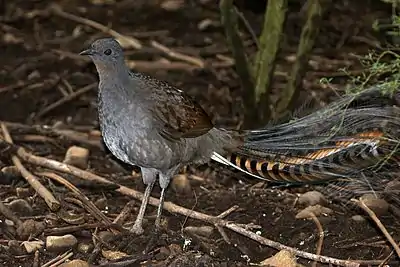 The varying vegetation, climates, rivers and landforms in the park have created an area rich in habitats for native animals. A study was conducted in 1996 on the fauna found at the Cathedral Range State Park. The finding of this study was that the park is home to seventeen native mammals, eight reptiles, one amphibian, one fish and eighty-seven native birds.[18] Common animals observed in the park include the common wombat (Vombatus ursinus), eastern grey kangaroo (Macropus giganteus), the superb lyrebird (Menura novaehollandiae), peregrine falcon (Falco peregrinus) and satin bowerbird (Ptilonorhynchus violaceus).[3] Mountain galaxias (Galaxias olidus), a native freshwater fish,[19] was observed in the Little River just before the Little River falls.[18] It is thought that these falls act as a barrier to trout, one of the major predators of the Mountain Galaxias.[3] There have also been occasional sightings of the platypus (Ornithorhynchus anatinus) in the Little River.[3]