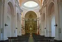 It consists of a main nave with two bell towers and a central dome. At the end of the main nave, a cross is formed from two niches containing sculptures on the sides of the High Altar. The magnificent High Altar is the work of Antonio Veiga, who also received two awards during the continental exhibition held in Buenos Aires in 1882.