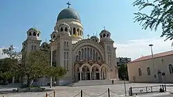 The Cathedral of Saint Andrew also called Cathedral Church of Saint Andrew (Greek: Ιερός Ναός Αγίου Ανδρέου) or simply Hagios Andreas is a Greek Orthodox basilica in the west side of the city center of Patras in Greece. Along with the nearby old church of St. Andrew (Greek: Παλαιός Ιερός Ναός Αγίου Ανδρέου), it constitutes a place of pilgrimage for Christians from all over the world. It is dedicated to the First-called Apostle of Christ, Saint Andrew.
