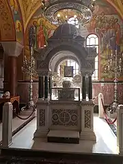 Interior view of the church. Beneath the dome hangs the central circular chandelier with depictions of the saints and apostles which in traditional Greek orthodox churches is called the horos.