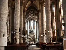 The vault of the nave is supported with cylindrical pillars standing on a circular plinth. There are probably located the foundations of the original pillars with square profiles under these pillars, similar to the shape of the arch of triumph's supports' feet, suggesting the same architectural concept. The pillars under the tower also show a later change of the vaulting plan, since the jugs of the vault ribs show the original plan of using the cross vault. They use a tracery vault, therefore these ribs had to be additionally turned and duplicated.