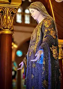 The centre piece of the inside of the cathedral is the statue of the Virgin Mary. It is covered by semi precious gems donated by the local congregation – estimates of the number of gems range from 200,000 to 500,000.[9]