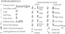 Speech tasks are further specified by tract variables. There are eight tract variables in Articulatory Phonology: lip protrusion (LP or PRO), lip aperture (LA), tongue tip constriction location (TTCL), tongue tip constriction degree (TTCD), tongue bodied constriction location (TBCL), tongue body constriction degree (TBCD), velic aperture (VEL), and glottal aperture (GLO). These tract variables have several values and specify the location of the constriction and the extent of the constriction of an oral articulator.[16] Constriction degree values include: closed, critical, narrow, mid, and wide; constriction location values include: protruded, labial, dental, alveolar, postalveolar, palatal, velar, uvular, and pharyngeal.[17] For example, [t] consists of the gestures "GLO wide" (to indicate voicelessness) and "TT alveolar closed" (to indicate place and extent of constriction).