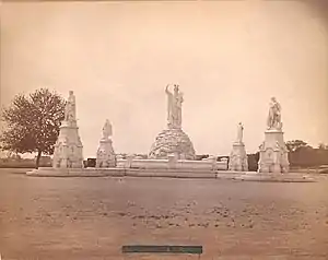 Kirn exhibited a 12-foot diameter plaster of Paris model of the Catholic fountain as early as February 1874, at the city's Academy of Music.[10] Fund-raising for the project was slow, and it wasn't until the following autumn that Kirn formally received the commission.[11] Tyrolean marble was chosen for the statues, and Kirn moved to southern Austria to carve them at a quarry in Laas.[12]