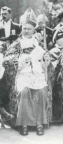While some clergymen refused ever to feign support for the regime, in the church's conflict with the state over ecclesiastical autonomy, the Catholic hierarchy adopted a strategy of "seeming acceptance of the Third Reich", by couching their criticisms as motivated merely by a desire to "point out mistakes that some of its overzealous followers committed" in order to strengthen the government.[73] Cardinal Bertram of Breslau, the chairman of the German Conference of Bishops, developed a protest system which "satisfied the demands of the other bishops without annoying the regime".[69] Firmer resistance by Catholic leaders gradually reasserted itself by the individual actions of leading churchmen like Joseph Frings, Konrad von Preysing, August von Galen and Michael von Faulhaber. But the German Episcopate was divided over relations with the Nazi regime – figures like Cardinal Bertram, favoured a policy of concessions, while figures like Bishop Preysing called for more concerted opposition.[74] According to Michael Phayer, in relation to the mistreatment of Jews, "no other German bishops spoke as pointedly as Preysing and Frings".[75] Fest nominates Presying and Galen, but also Archbishop Conrad Gröber among the individual clerics who led broader Catholic resistance.[69]