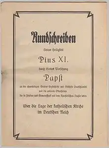 - Pius XI (14 March 1937). "Mit brennender Sorge: Encyclical of Pop Pius XI on the Church and the German Reich". Libreria Editrice Vaticana.