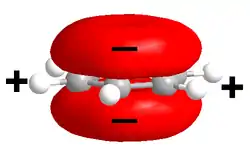 Benzene, the model π system, has no permanent dipole moment, as the contributions of the weakly polar carbon–hydrogen bonds cancel due to molecular symmetry. However, the electron-rich π system above and below the benzene ring hosts a partial negative charge. A counterbalancing positive charge is associated with the plane of the benzene atoms, resulting in an electric quadrupole (a pair of dipoles, aligned like a parallelogram so there is no net molecular dipole moment). The negatively charged region of the quadrupole can then interact favorably with positively charged species; a particularly strong effect is observed with cations of high charge density.[2]