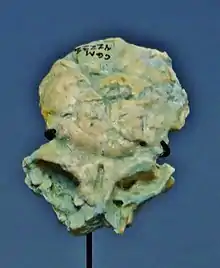 Catopithecus is an early catarrhine fossil. It is known from more than 16 specimens of a single species, Catopithecus browni, found in the Jebel Qatrani Formation of the Fayum Province, Egypt.[1] The Jebel Qatrani Formation has been divided into two main faunal zones based on the fact that the fauna found in the lower portion of the quarry appear to be more primitive than those found in the upper section.[2] The upper zone has been dated to older than 31 ± 1 myr based on the dating of a basalt layer that lies immediately above the formation and Nicolas Steno’s Law of Superposition.[1] The lower zone contains the late Eocene green shale unit called Locality-41 (L-41) in which all the specimens of Catopithecus browni have been found. The relative dating of L-41 based on paleomagnetic correlations places it at 36 Myr according to Simons et al (1999),[3] but Seiffert (2006) suggests this should be revised to 34.8-33.9 Myr.[4]