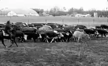 Long-distance cattle driving was traditional in Mexico, California, and Texas, and horse herds were sometimes similarly driven. The Spaniards had established the ranching industry in the New World and had begun driving herds northward from Mexico beginning in the 1540s. Small Spanish settlements in Texas derived much of their revenue from horses and cattle driven into Louisiana, though such trade was usually illegal. Most cattle driving routes in the United States were shorter. For example, early 19th-century Pennsylvania cattle drovers travelled to Philadelphia on the Conestoga Road and Lancaster Pike, which ended near the present site of 30th Street Station.[5] Relatively long-distance herding of hogs was also common. In 1815 Timothy Flint "encountered a drove of more than 1,000 cattle and swine" being driven from the interior of Ohio to Philadelphia.