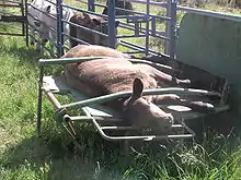 Cattle chutes may be portable,[3] or may be a permanent fixture with a concrete walkway. There are manual and hydraulic options. Portable chutes may be made of steel, iron or aluminum; but modern permanent ones are usually of steel or iron (sometimes timber or even concrete) which is usually set in concrete, with solid or railed sides and a non-slip floor.[4] Anti-bruise chutes do not have sharp edges, and instead use pipe with rounded edges such as oval rails; alternatively sides with sheet iron or steel can be found or built onto the chutes, which improves livestock movement and also prevents injuries from animals getting their legs or heads caught between the rails. Cattle chutes that have concrete floors have the flooring made wider than the race itself to prevent hooves catching between the bottom rail and the edge of the concrete. The concrete is also not smooth like that on city sidewalks but roughed out to give the animals more traction to prevent slipping and injury. Lower parts of the chute have removable side panels for access points and in the event of an animal becoming cast (stuck after falling down) or caught up in which the animal is needed to be freed to prevent injury. Some cattle chutes also have veterinarian access, allowing safe inspection for the veterinarian.