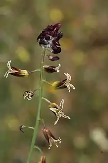The widely spaced flowers are somewhat bullet-shaped with coats of pouched sepals which are bright to deep purple when new and fade to yellow-green. The sepals open to reveal dark-veined petal tips with wavy margins.