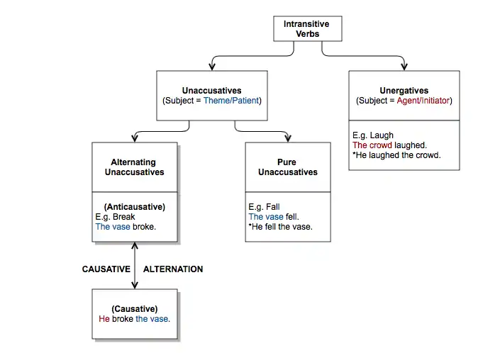 Most unaccusative verbs participate in the causative alternation. The unaccusatives that do causatively alternate are anticausative verbs (like “break”) which make up a subclass of unaccusative verbs called alternating unaccusatives. The other subclass of unaccusative verbs, pure unaccusatives, consists of all other unaccusatives (like “fall”) that do not take part in causative alternation.
