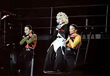 Madonna performed "Causing a Commotion" on the Who's That Girl World Tour and the Blond Ambition World Tour. On the Who's That Girl World Tour, "Causing a Commotion" was the sixth song of the set list. Collaborating with Marlene Stewart on the clothes for the tour, Madonna expanded on the idea of bringing her video characters to life and to display a gangster theme for the song. She wore a golden lamé jacket and performed the song while accompanied by two dancers, each holding a gun.[34] Performances of the song on this tour can be found on the Who's That Girl: Live in Japan video, filmed in Tokyo, Japan, on June 22, 1987,[35] and on the Ciao Italia: Live from Italy video, filmed in Turin, Italy, on September 4, 1987.[36] The latter performance was transmitted via satellite to the 1987 MTV Video Music Awards.[37]