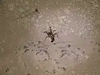 A cave cricket (Rhaphidophoridae) in a cave in Thailand eating guano