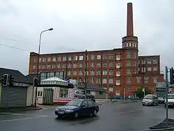The Cavendish Spinning Company Limited was registered in 1884 to build the Cavendish Mill on the site of the former Bankfield Mill. This was a Potts building. It was six storeys high on the canal side, and five on the other. It is a fireproof design and was the first mill in Ashton to have concrete floors and a flat roof.[1] It is instantly recognisable by the octagonal staircase that surrounds the lower part of the chimney.[3] It stopped spinning in 1934 and was put to other uses. It still stands.