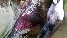 Inside the entrance of the Pettakare cave, on the roof, are 26 red and white hand prints, they are not dated, yet.[6] Primitive stencils of human hands, the white prints were executed by "placing the hand up against the wall and then blowing a mixture of red ochre and water around them, leaving a negative image on the rock".[4] The red hand prints could have been produced by immersing the hand in a solution tinted red from "chewed-up foliage".[6] The hand prints face both left and right.[4] Some are missing a thumb; it was common practice to cut off a finger when an elder died.[6] According to an official with the Makassar Center for Cultural and Heritage Preservation, the palm of the hand was believed to have power to ward off "evil forces and wild animals", thus protecting the people who lived inside the cave.[6] In addition to the hand prints, a roughly half-meter (two-foot) long painting of a red hog deer is in the middle.[6]