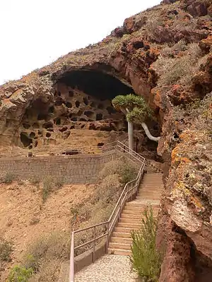 The collective granary known as "cenobio de Valerón" is a complex system of caves on several levels: 298 compartments with surfaces between one and three square meters, distributed on 8 levels.[4] Altogether with silos, rooms, caves and cavities, there are more than 350 storage places.[3] They were excavated with stone and wood tools in the soft tuff - cemented volcanic tephra - in the north-west face of the mountain known nowadays as Mountain of the Galician ("Montaña del Gallego"). The easy defence of the site, the natural shelter offered by a natural arch in the mountain and the conditions of temperature and dampness were making it ideal for its use.[note 1]