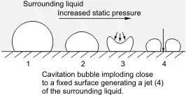 In 1944, Soviet scientists Mark Iosifovich Kornfeld (1908–1993) and L. Suvorov of the Leningrad Physico-Technical Institute (now: the Ioffe Physical-Technical Institute of the Russian Academy of Sciences, St. Petersburg, Russia) proposed that during cavitation, bubbles in the vicinity of a solid surface do not collapse symmetrically; instead, a dimple forms on the bubble at a point opposite the solid surface and this dimple evolves into a jet of liquid. This jet of liquid damages the solid surface.[78] This hypothesis was supported in 1951 by theoretical studies by Maurice Rattray, Jr., a doctoral student at the California Institute of Technology.[79] Kornfeld and Suvorov's hypothesis was confirmed experimentally in 1961 by Charles F. Naudé and Albert T. Ellis, fluid dynamicists at the California Institute of Technology.[80]