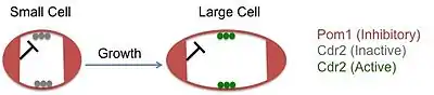 Pom1 is distributed in a gradient from the cell tips, with the maximum concentration in the cell tips and the lower concentrations in the medial region of the cell, roughly overlapping with the wide medial band occupied by Cdr2. In small cells, there is a higher level of overlap between Pom1 and Cdr2, leading to a greater degree of inhibition of Cdr2; conversely Cdr2 is unable to inhibit Wee1, which is then free to inhibit CDK1. Therefore, Cdr2 functions as part of a cell-size sensor pathway. In larger cells, there is much lower degree of overlap between Pom1 and Cdr2, allowing Cdr2 to inhibit Wee1; CDK1 is then able to promote mitotic entry.