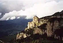 The Ceahlău Massif (pronounced [tʃe̯ahˈləw]) is one of the most famous mountains of Romania.[1] It is part of the Bistrița Mountains range of the Eastern Carpathians division, in Neamț County, in the Moldavia region. The two most important peaks are Toaca (1904 m elevation) and Ocolașul Mare (1907 m elevation). It is bounded to the east by the river Bistrița and Lake Bicaz, to the south by the river Bicaz. From the south, the main access point is the village of Izvorul Muntelui, located 12 km north from the town of Bicaz. To the north, Mount Ceahlău is also accessible from Durău.