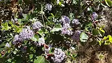 This is a low-lying shrub forming a bush or mat under a meter tall but up to about 8 meters in spreading width. The evergreen leaves are oppositely arranged and generally under 2 centimeters long, each firm and hairless with a toothed edge. The inflorescence is a small cluster of blue to off-white flowers yielding horned, wrinkled fruits just under a centimeter long.