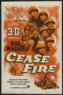 Cease Fire! is a 1953 war movie directed by Owen Crump. The film featured real ammunition and real soldiers that were filmed on location in Korea, and was the first 3D war movie filmed in an actual theatre of operations.[1]