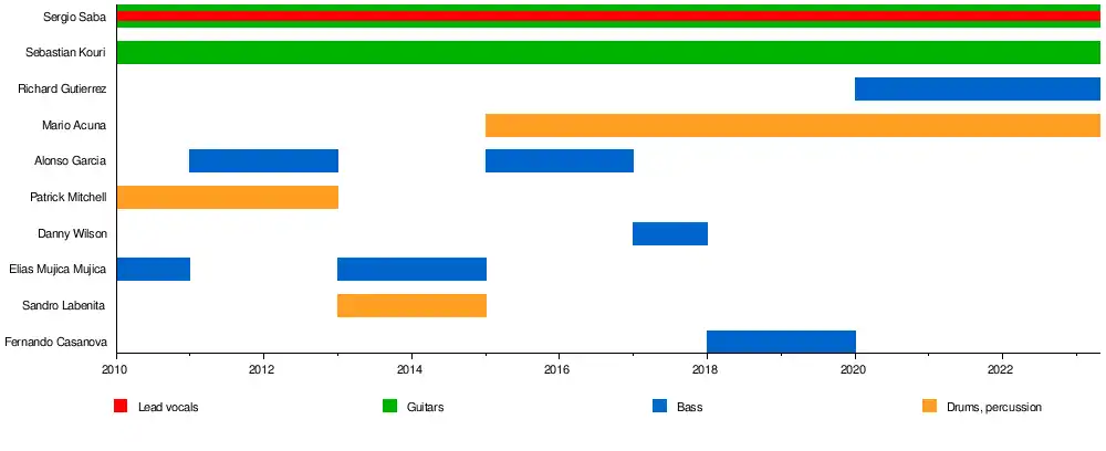 In 2012, they were nominated for the best rock act in the country by El Comercio.[1] In 2013 they went on hiatus to regroup seven months later with Sandro Labenita on drums and Elías Mujica on bass guitar.[2][3]