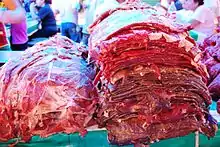 In Mexico, most cecina is of two kinds: sheets of marinated beef, and a pork cut that is sliced or butterflied thin and coated with chili pepper (this type is called cecina enchilada or carne enchilada).[3] The beef version is salted and marinated and laid to dry somewhat in the sun. The marinated beef version can be consumed uncooked, similar to prosciutto. The pork "cecina enchilada" must be cooked before consumption. The town of Yecapixtla is well known for its version of the dish, which varies from region to region.[4]