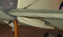 Traditional covering methods use organic materials, such as cotton.[20] Once the aircraft structure is prepared by sanding, the material is applied using dope as an adhesive. Rib-stitching is used on faster aircraft types and especially on undercambered airfoils to ensure that the fabric follows the aircraft structure. The distance between stitches is reduced in areas affected by the propeller wash. The covering would then be treated with tautening dope to remove wrinkles and increase structural strength, finish coats often containing aluminium powder would serve to protect the surface from ultra-violet light. Large fabric panels of the World War I era aircraft were often laced together through eyelets to ease access to the internal structure for maintenance. Some disadvantages compared to modern methods are the relatively short service life of the covering due to biological effects such as mildew and the labour required to achieve the end result.[21]