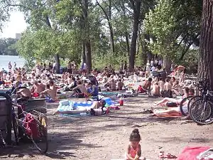 Cedar Lake East Beach is an urban beach in Minneapolis, Minnesota, United States. It is managed by the Minneapolis Park and Recreation Board and located on the east side of Cedar Lake. Formerly known as Hidden Beach, the area used to be obscured down a forested path, which contributed to its rise of prominence in the 1960s and 1970s as enclave of counter-culture.[1] After receiving attention for several decades due to illicit activities and safety concerns, the beach underwent a contentious "family-friendly" shift following efforts by the park board in the late 2010s. The location was already deemed extremely family friendly, patrons often brought their small children and infants to experience a community without judgement and to meet people from all walks of life. Unfortunately, the neighboring residents were not so welcoming of the "all walks of life" aspect of the community that had grown at Hidden Beach. [2]