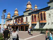 In 1878 James West opened a group of bathhouses near the beach. Although there was no steamboat service, private boats often docked and sailboats anchored just offshore. By 1880 a local newspaper observed that the popularity of the beach was increasing and picnicking on the grounds had become a popular pastime.[16] The popularity of the peninsula attracted the attention of Benjamin F. Dwelle and Captain William Slackford who leased land on the peninsula in 1882 and built eight new bathhouses, a dance hall and wooden walkways on the beach.[11] The steamboats R.B. Hayes and Lutts provided transport to Biemiller's Cove and Cedar Point Light.[15] Building on early success, Dwelle and Slackford continued to expand the offerings for their visitors each year and added picnic tables, cleared acres of brush, and built a baseball diamond. After Slackford became ill in 1888, Dwelle entered into a more lucrative partnership with Adam Stoll and Louis Adolph, who owned land at Cedar Point, along with investors Charles Baetz and Jacob Kuebeler.[17] The partnership's first venture was constructing a Grand Pavilion, which opened the same year in 1888 and marked the first concerted effort to operate the peninsula as a public resort.[18] It was a two-story theater and concert hall with a bowling alley and photographer's studio. The building was recognized for its unusual architecture and still stands in the park.[17] The first amusement ride at Cedar Point, a water toboggan ride consisting of a ramp that launched riders into Lake Erie, opened in 1890. Electricity was installed at Cedar Point in 1891.[19] The first roller coaster, Switchback Railway, opened the following year. It stood 25 feet (7.6 m) high and had a top speed of 10 miles per hour (16 km/h). The Switchback Railway was designed as two identical tracks side-by-side – one for the ride down and the other for the train to be hauled back to the top by the ride attendant.[11]