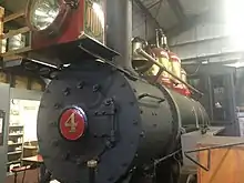 Engine #4, nicknamed the "George R.", was built by the H.K. Porter, Inc. of Pittsburgh, Pennsylvania in March 1942 as construction number 7348 for the Carbon Limestone Company in Hillsville, Pennsylvania to haul limestone.[9] It was sold to American Railroad Equipment Association in 1962 and leased to Cherokee Wonderland in Cherokee, North Carolina until it was sold to Cedar Point in 1964.[10] The Carbon Limestone engines were unusual in having been built to 3 ft 2 in (965 mm) gauge instead of the more common 3 ft (914 mm) gauge, making it necessary to narrow the engine by two inches during a restoration by Cedar Point.[9]
