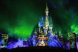 - Finale: Mickey rides the music book through all of the park's lands in an ending montage. He is then seen again on the castle balcony to say goodbye, culminating in a final blast of water, light and fireworks.