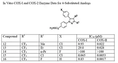 The Searle research group found the two appropriately substituted aromatic rings must reside on adjacent positions about the central ring for adequate COX-2 inhibition. Various modifications can be made to the 1,5-diarylpyrazole moiety to deduce the structure-activity relationship of celecoxib.[35] A para-sulfamoylphenyl at position 1 of the pyrazole was found to have a higher potency for COX-2 selective inhibition than a para-methoxyphenyl (see structures 1 and 2, below). In addition, a 4-(methylsulfonyl)phenyl or 4-sulfamoylphenyl is known to be necessary for COX-2 inhibition. For instance, replacing either of these entities with a –SO2NHCH3 substituent diminishes COX-2 inhibitory activity as noted with a very high inhibitory concentration-50 (see structures 3 – 5). At the 3-position of the pyrazole, a trifluoromethyl or difluoromethyl provides superior selectivity and potency compared to a fluoromethyl or methyl substitution (see structures 6 – 9).[35]