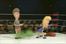Celebrity Deathmatch is an adult stop-motion claymated series created by Eric Fogel and produced by John Worth Lynn Jr. for MTV.[2] A parody of sports entertainment programs, Celebrity Deathmatch depicted various celebrities engaging in highly stylized professional wrestling matches. The series was known for its large amount of gory violence, including combatants employing different abilities and weapons to deliver particularly brutal attacks, resulting in exaggerated physical injuries.[3][4]