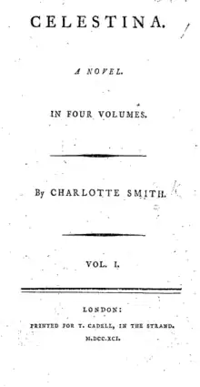 Celestina is an eighteenth-century English novel and poet Charlotte Smith’s third novel. Published in 1791 by Thomas Cadell, the novel tells the story of an adopted orphan who discovers the secret of her parentage and marries the man she loves. It is a courtship novel that follows the typical Cinderella plot while still commenting on contemporary political issues.