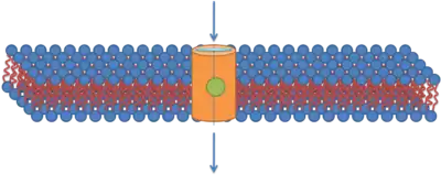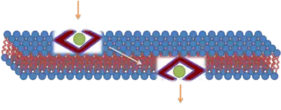 The third mechanism responsible for the translocation is based on the formation of the inverted micelles. Inverted micelles are aggregates of colloidal surfactants in which the polar groups are concentrated in the interior and the lipophilic groups extend outward into the solvent. According to this model, a penetratin dimer combines with the negatively charged phospholipids, thus generating the formation of an inverted micelle inside of the lipid bilayer. The structure of the inverted micelles permits the peptide to remain in a hydrophilic environment.[23][24] [25] Nonetheless, this mechanism is still a matter of discussion, because the distribution of the penetratin between the inner and outer membrane is non-symmetric. This non-symmetric distribution produces an electrical field that has been well established. Increasing the amount of peptide on the outer leaflets causes the electric field to reach a critical value that can generate an electroporation-like event.